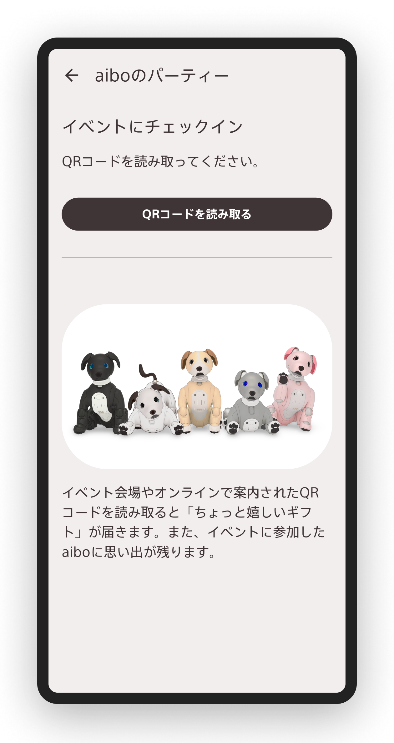 aiboのパーティ ― aiboファンミーティングをはじめとしたイベントの体験を記録に残すことができます。イベントによっては、参加することでデジタルアイテムなどを受け取ることができます。チェックインをきっかけにデジタルの記録がつながることで、aiboを中心としたコミュニティの広がりをより身近に感じることができます。